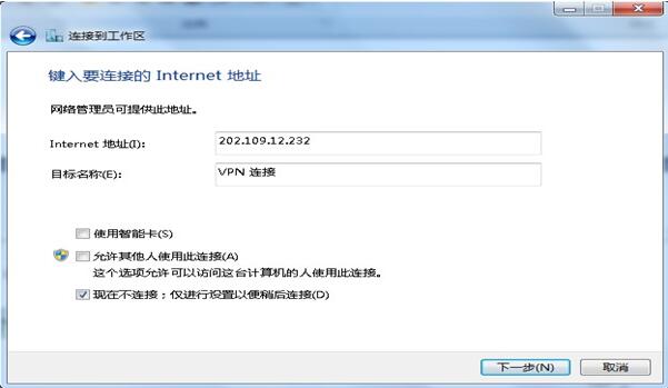 6. .在键入要连接的Internet地址页上输入入您的Internet地址:浙江企业 “61.164.1.37或202.96.97.240”,上海企业“202.109.12.232”,内蒙古企业“222.74.227.22”,湖北企业“58.53.195.26”,徐州企业(电信VPDN开户)“221.226.82.198”,徐州企业(联通VPDN开户)“119.167.233.221”,福建企业(电信VPDN开户)“61.131.0.20或61.131.0.21”,福建企业(联通VPDN开户)“119.167.233.221”。目标名称不用更改,勾选“现在不连接:仅进行设置以便稍后连接”复选框,点击“下一步”按钮;