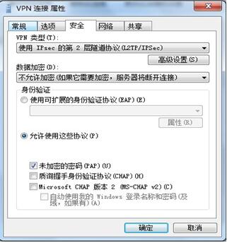 11. 单击“安全”选项把“VPN类型”选择为“使用IPsec的第2层隧道协议(l2tp/IPsec)”在“数据加密”里选择“不允许加密”,在“允许这些协议”里面勾选“未加密的密码”,江苏企业还需将“质询握手身份验证协议“打勾,其余的勾都去掉,然后点“确定”。